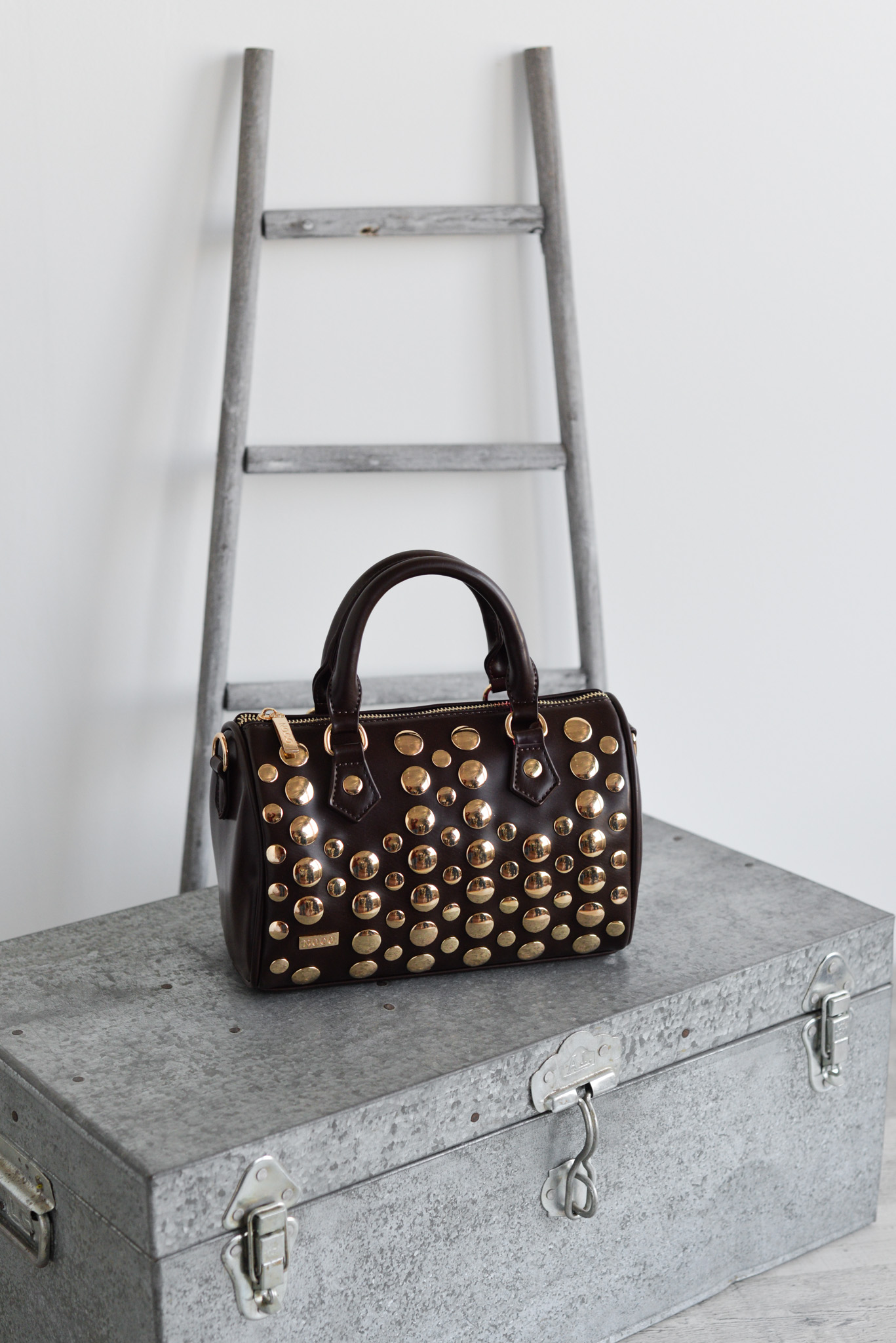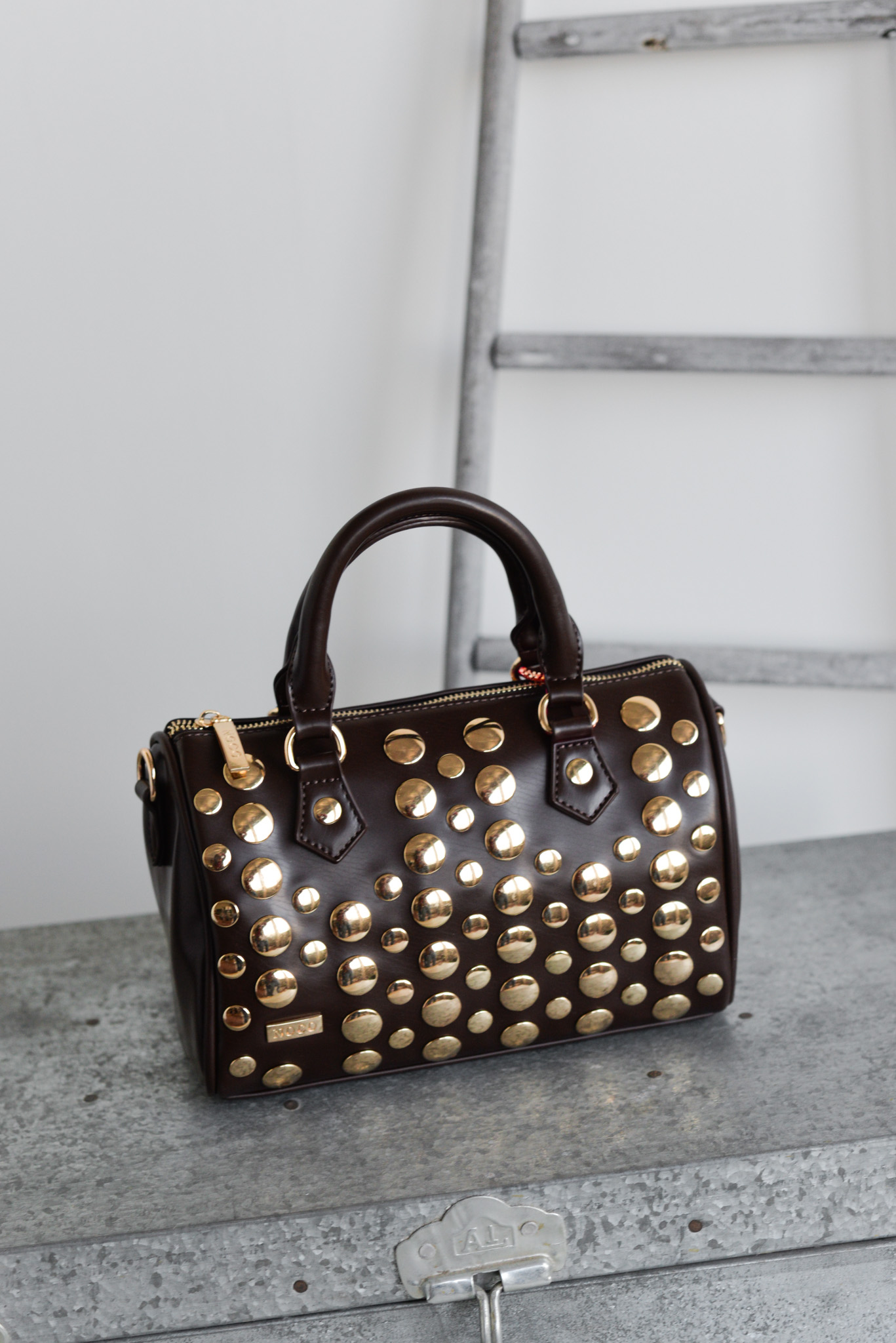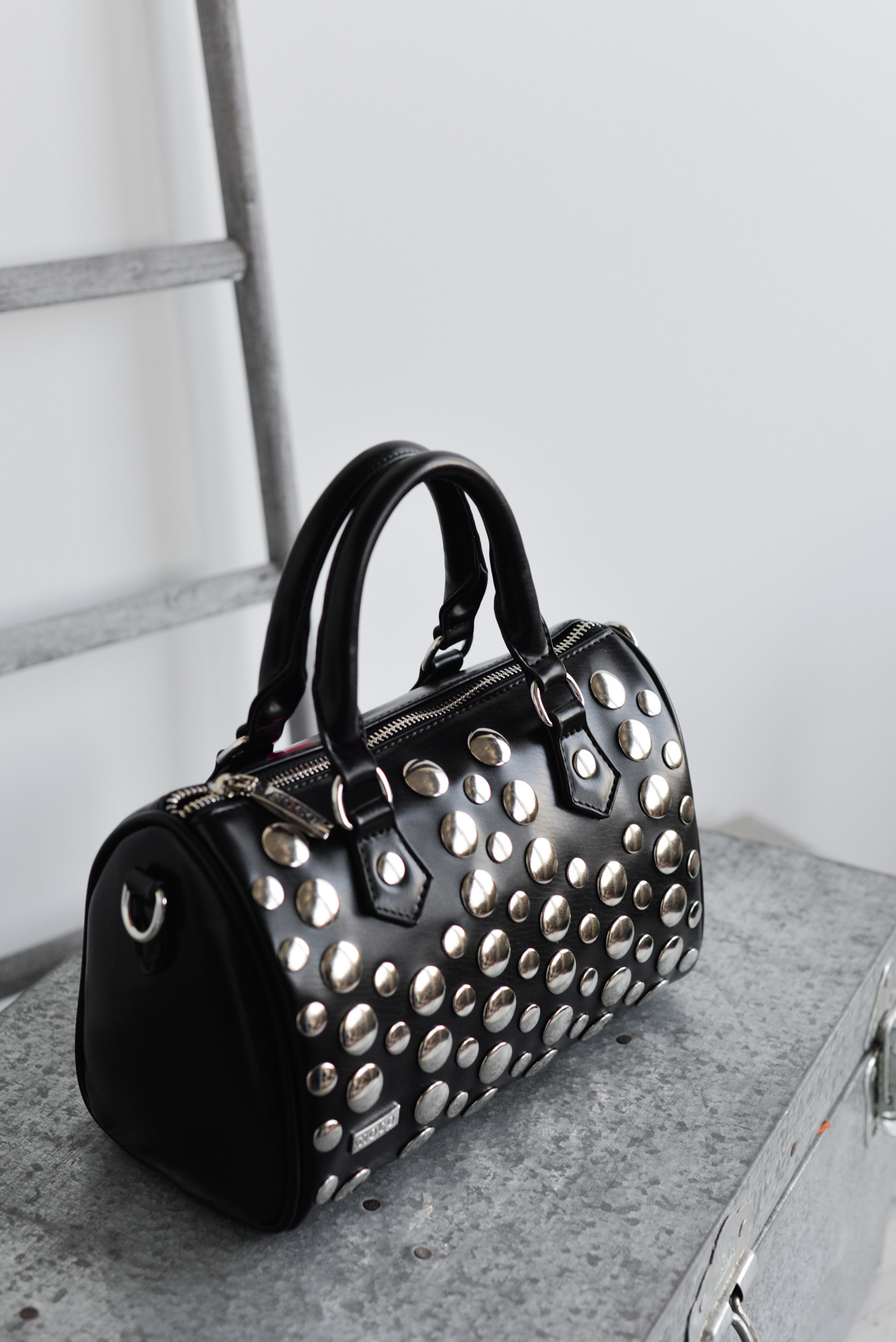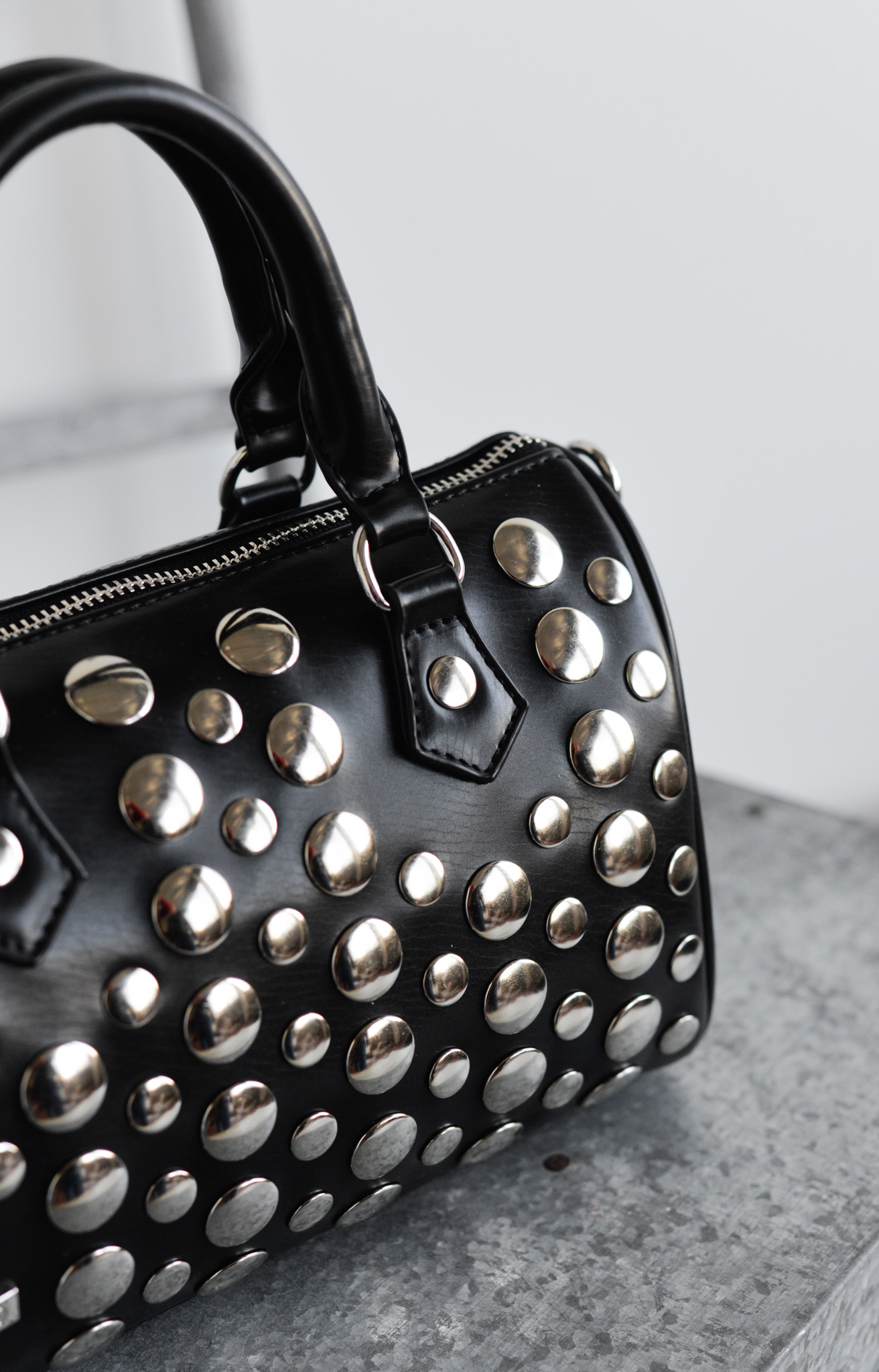Bolso bowling pequeño de piel sintética gruesa está totalmente cubierto de tachuelas grandes, aportando un diseño moderno y llamativo.