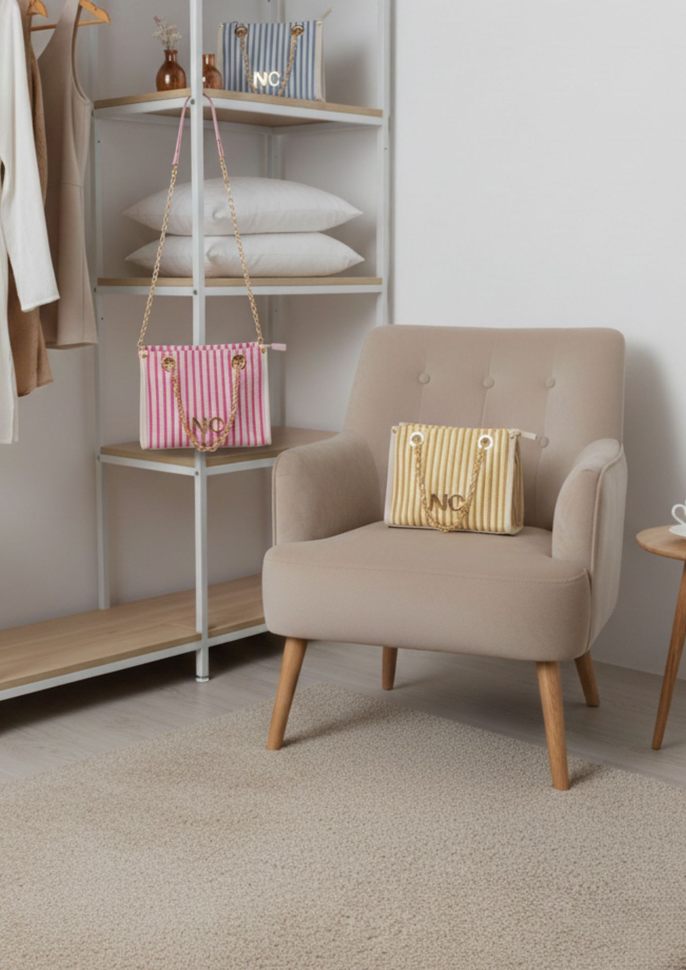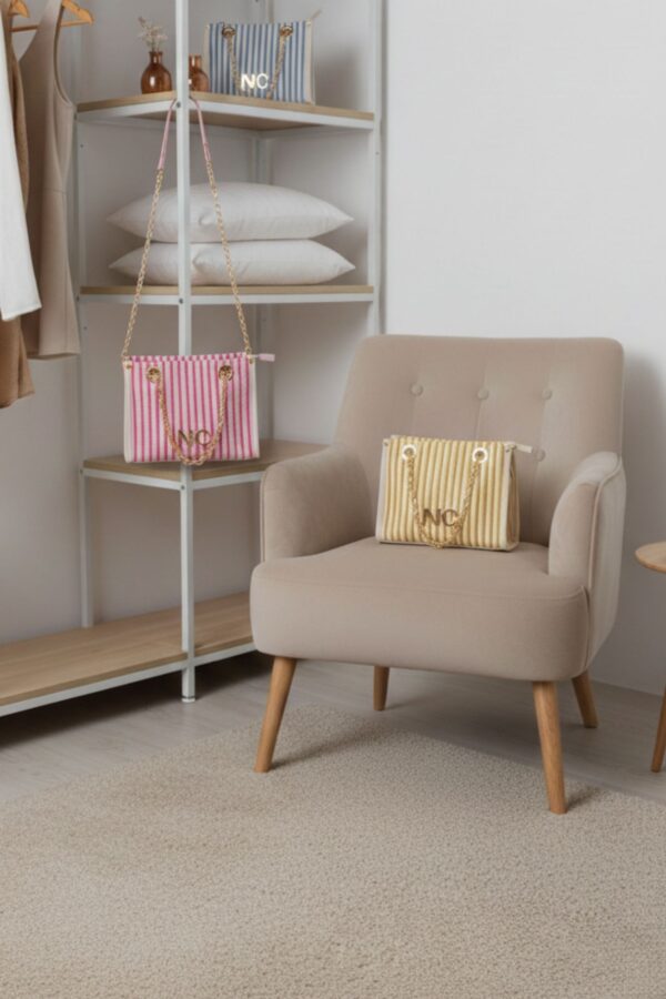 Fabricado en lona a rayas con textura y relieve, combina una base beige con rayas de color que aportan frescura y personalidad. Disponible en amarillo, rosa o azul, es perfecto para dar un toque veraniego a cualquier look.