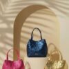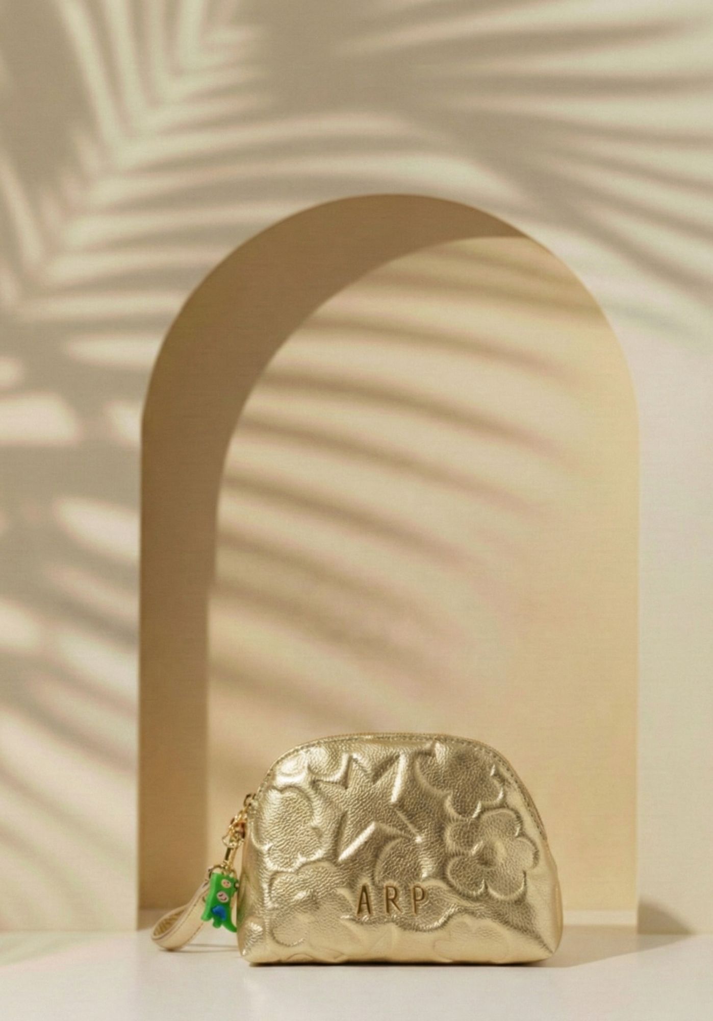 Este neceser ovalado de Agatha Ruiz de la Prada está diseñado en piel sintética metalizada, con un acabado elegante y luminoso que aporta un toque sofisticado. El material incorpora los iconos de la marca grabados en relieve, creando un efecto visual con volumen que eleva el diseño y lo hace muy especial.