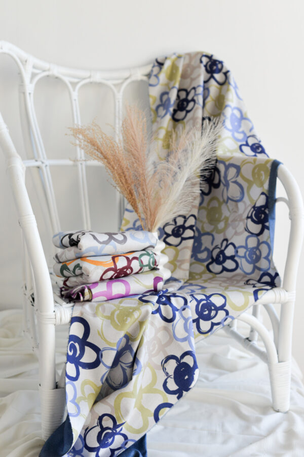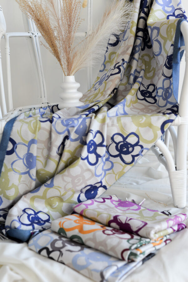 Pashmina reversible diseñada con estampado de flores dibujadas en estilo grafitti en distintos colores en una de sus partes y por el otro lado en color liso.