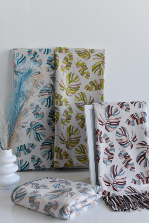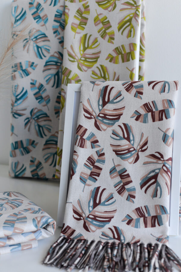 Pashmina reversible diseñada con estampado de hojas en una de sus partes y por el otro lado en color liso.