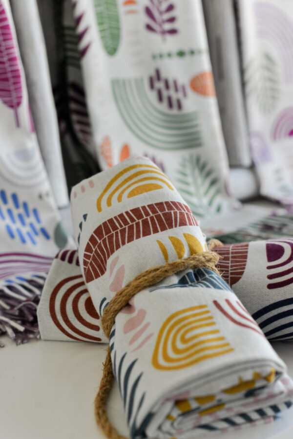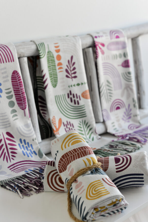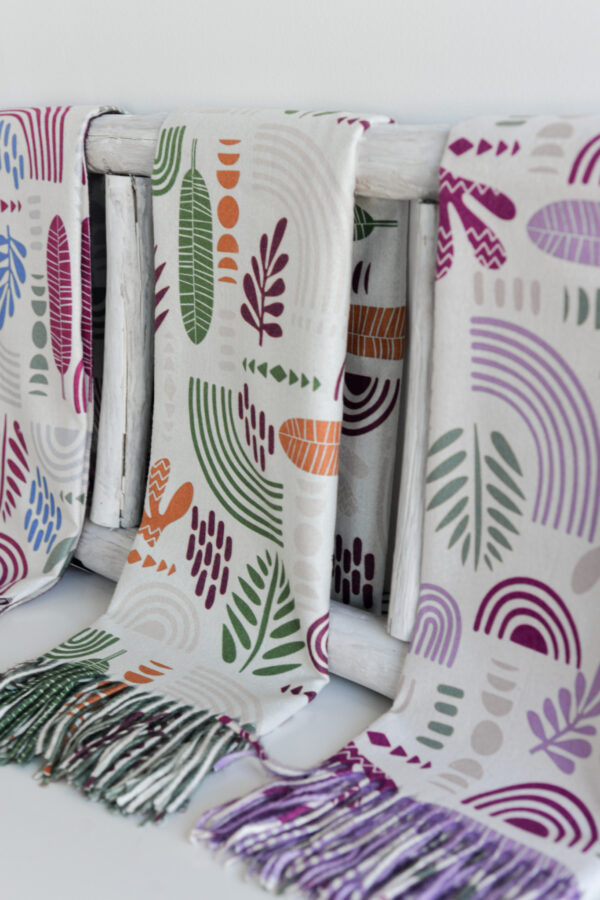 Pashmina reversible diseñada con estampado de iconos minimalistas en distintos colores en una de sus partes y por el otro lado en color liso.