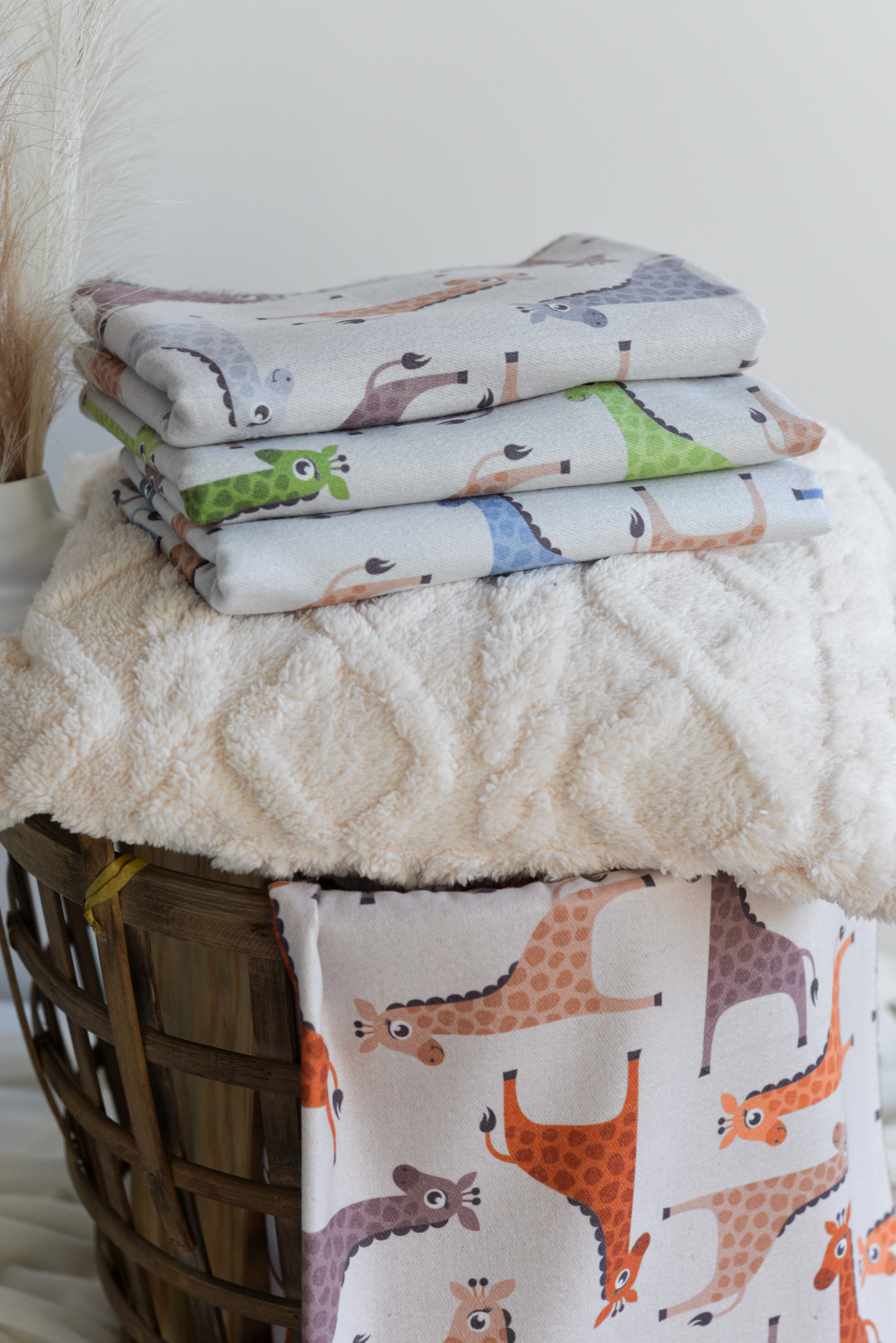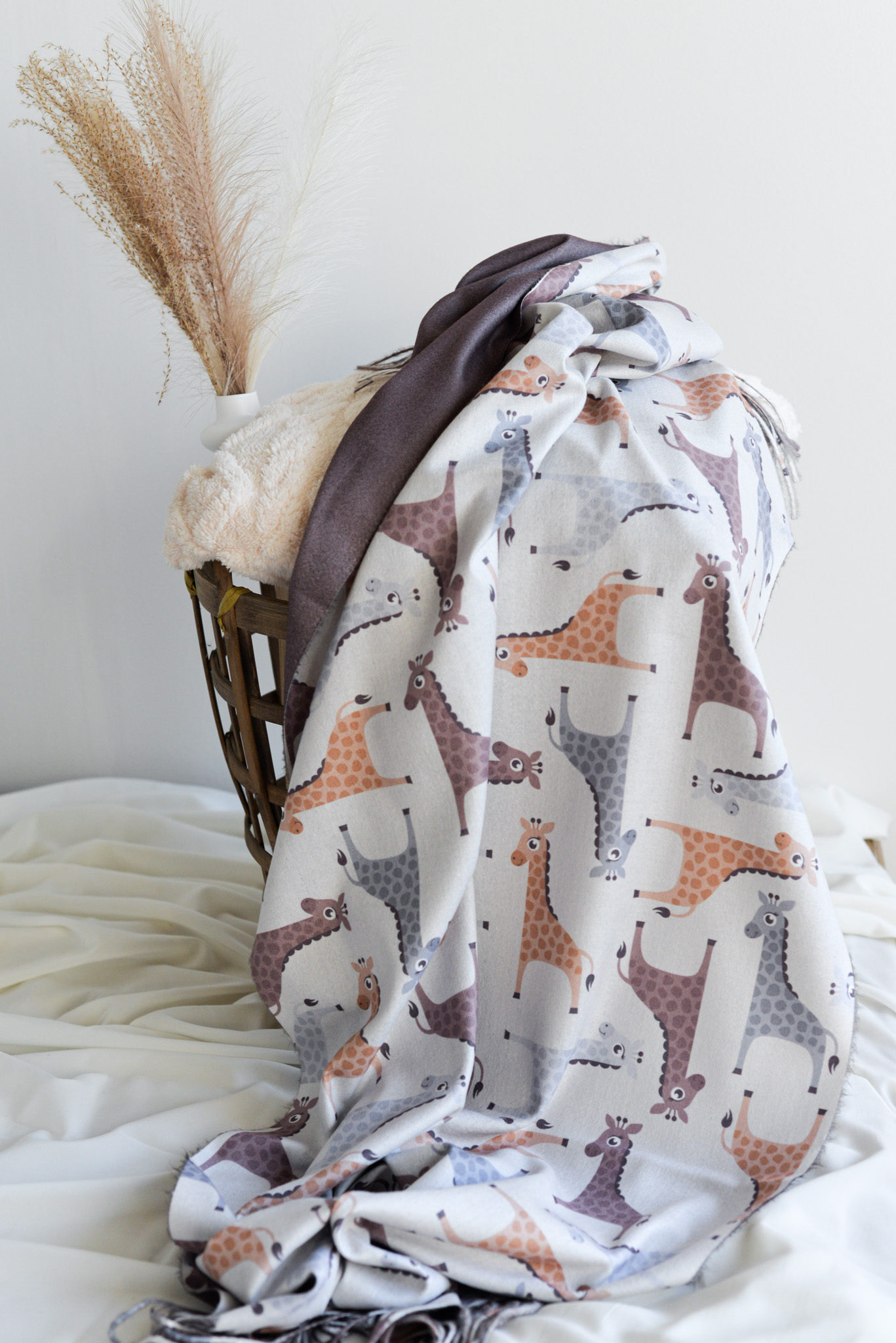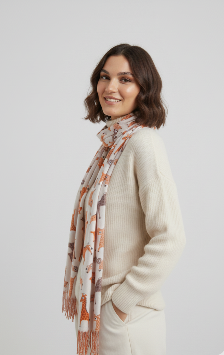 Pashmina reversible diseñada con estampado de jirafas en una de sus partes y por el otro lado en color liso.
