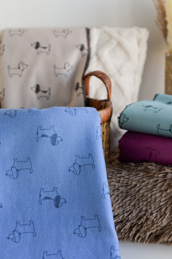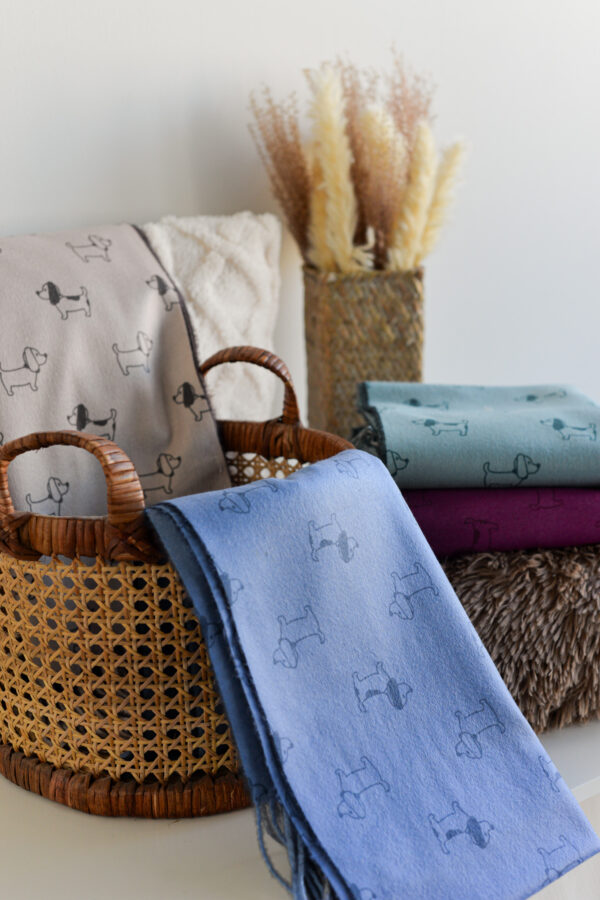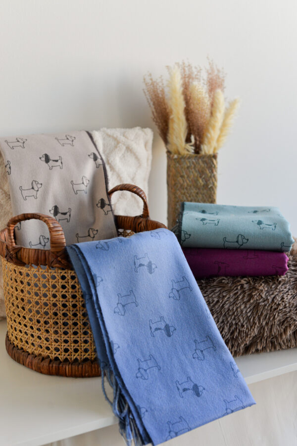 Pashmina reversible diseñada con estampado de perritos en distintos colores en una de sus partes y por el otro lado en color liso.