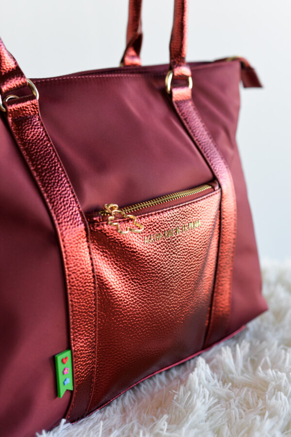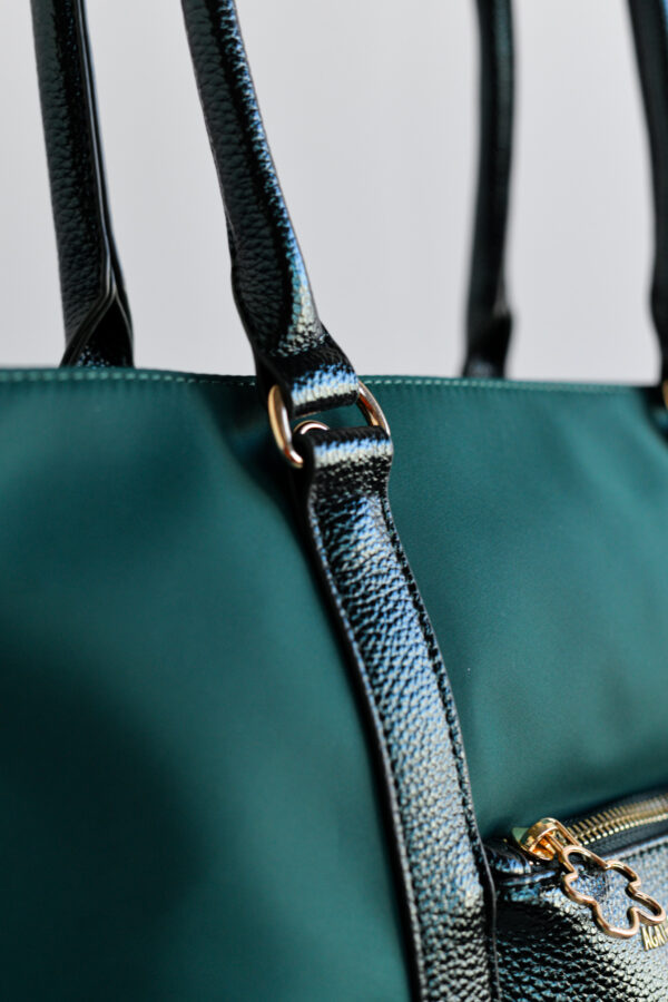 Ligero, funcional y con un toque de sofisticación. Este bolso shopper extra grande combina la resistencia y frescura del nylon con la elegancia de la piel sintética metalizada a tono, creando un accesorio versátil para el día a día.