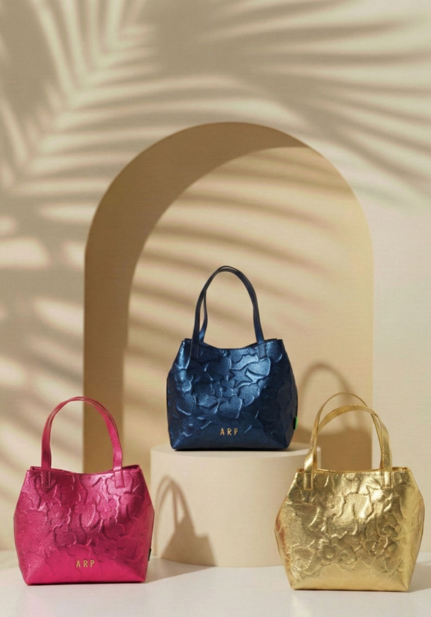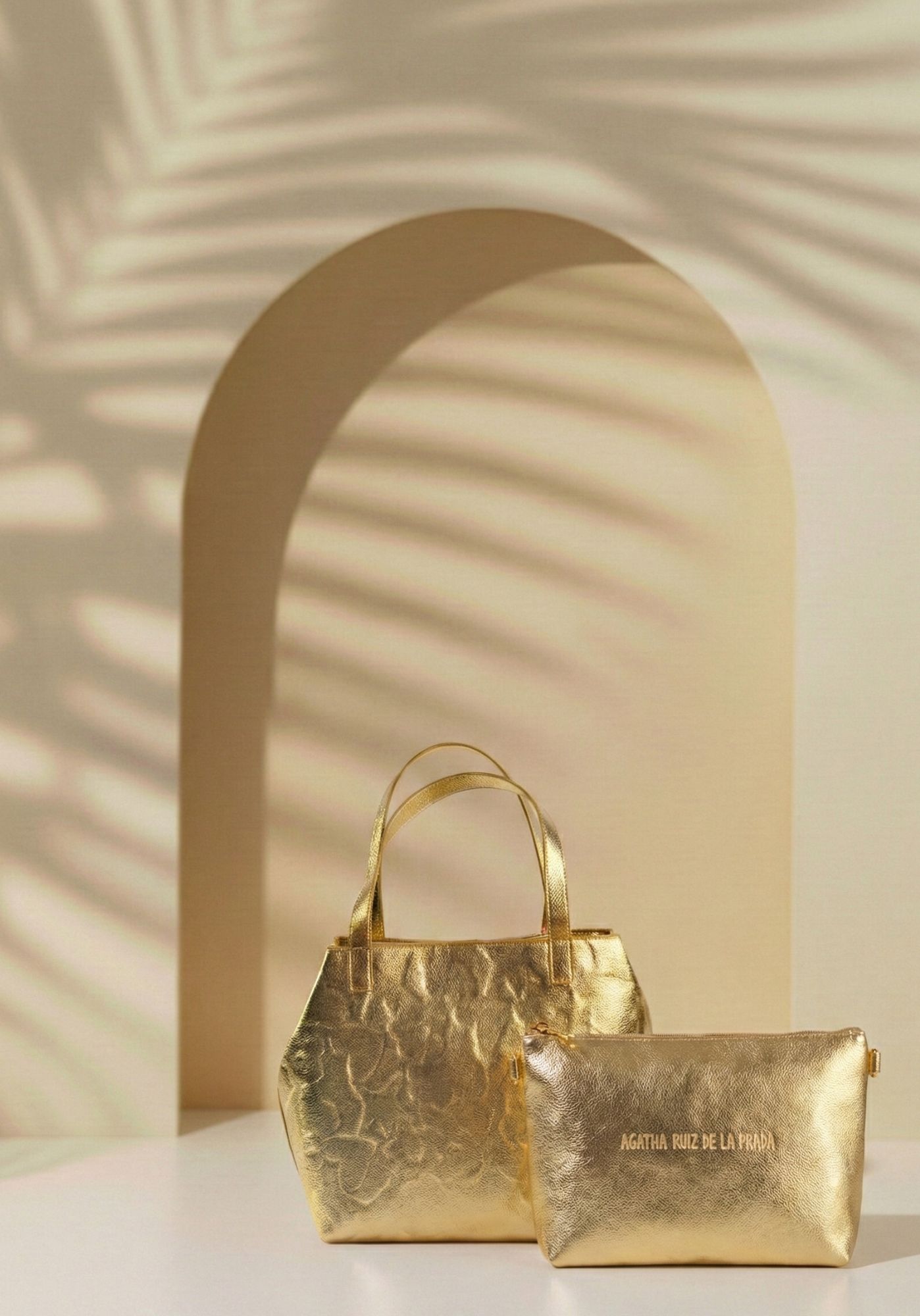 Este bolso tote de Agatha Ruiz de la Prada está diseñado en piel sintética metalizada, con un acabado elegante y luminoso que aporta un toque sofisticado a cualquier look. El material incorpora los iconos de la marca grabados con volumen, creando un efecto en relieve que añade textura y personalidad al diseño.